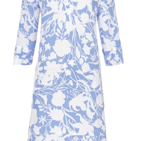 Tunika-Kleid mit V-Ausschnitt und 3/4-Ärmeln, gefertigt aus hochwertiger Baumwoll-Modal-Ware in Single Jersey-Qualität. Das Material ist von schöner Farbbrillanz. Das florale Dessin verleiht dem Outfit einen femininen Touch. Seitliche Eingrifftaschen und Seitenschlitze am Saum sorgen für zusätzlichen Komfort und geben mehr Bewegungsfreiheit. Perfekt für einen angenehmen Start in den Tag.