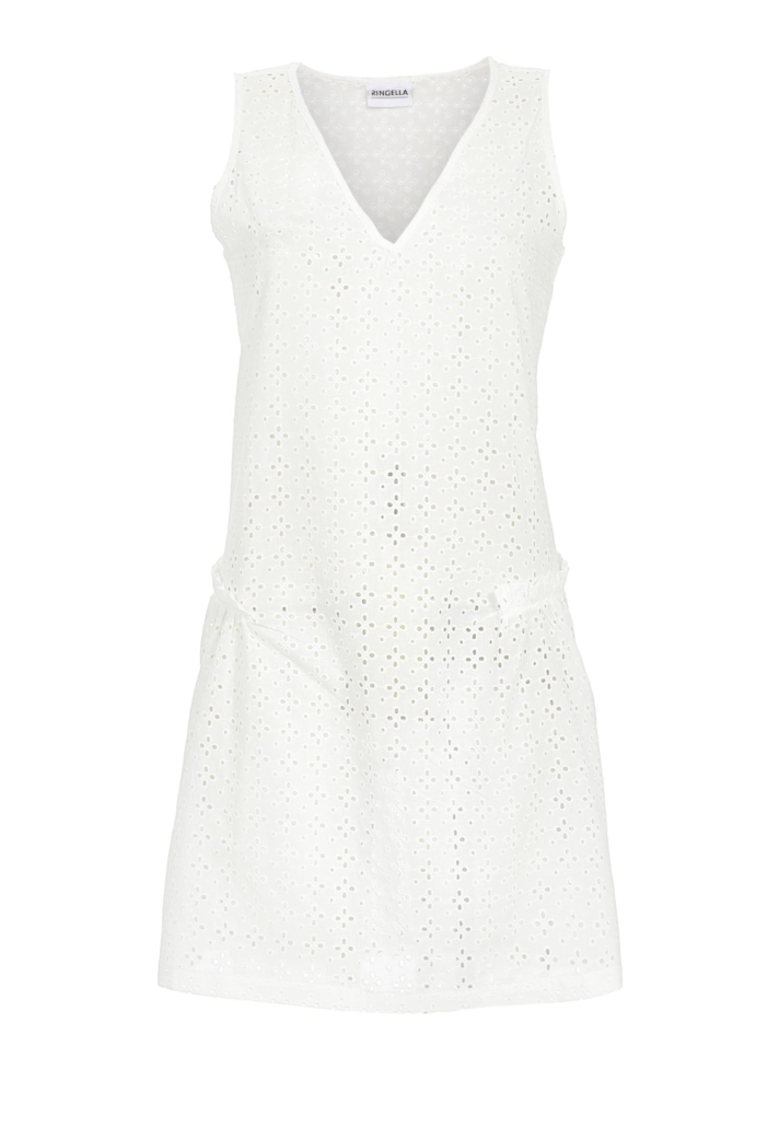 Dieses ärmellose Kleid hat sich ganz der Romantik verschrieben. Eine dekorative Lochstickerei bestimmt hier die Optik. Zwei angedeutete Taschen in Form einer Rüschchenverzierung auf dem Vorderteil geben diesem Modell den letzten Schliff. Hergestellt aus reiner Baumwolle in Webwaren-Qualität, liegt der Stoff luftig und leicht auf der Haut. Ein schönes Teil für die warme Jahreszeit.