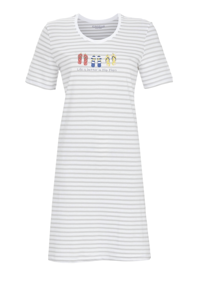 Dieses Sleepshirt macht einfach Lust auf Sommer. Mit einem hübschen Motivdruck mit Flip Flops auf dem Vorderteil wird es schnell zum Hingucker. Im trendigen Ringeldessin und mit gerader Schnittform, garantiert dieses Sleepshirt bequeme Stunden und läßt die modische Komponente nicht zu kurz kommen. Zugleich bie