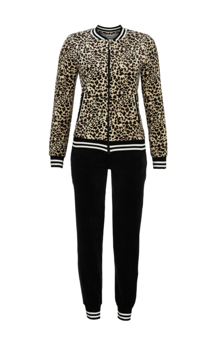 Dieser Damen Hausanzug ist die ideale Wahl für gemütliche Stunden zu Hause und bietet sowohl Stil als auch Komfort. Die Reißverschlussjacke im trendigen Animalprint ist ein echter Hingucker und wird durch die geringelten Strickbündchen am Kragen, den Ärmeln und dem Saum perfekt abgerundet. Die Pattentaschen sind ein modisches Detail. Die lange Hose ist mit einem bequemen Gummizugbund ausgestattet, der für eine optimale Passform sorgt, während die Beinabschlüsse mit geringelten Strickbündchen zusätzlichen Komfort bieten. Seitliche Eingrifftaschen machen den Look komplett. Hergestellt aus hochwertiger Nickiware, bietet dieser Hausanzug ein besonders weiches und angenehmes Tragegefühl auf der Haut. Der Elasthan-Anteil sorgt zudem für Bewegungsfreiheit und eine perfekte Passform. Ideal für entspannte Abende auf der Couch oder gemütliche Morgenstunden.