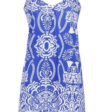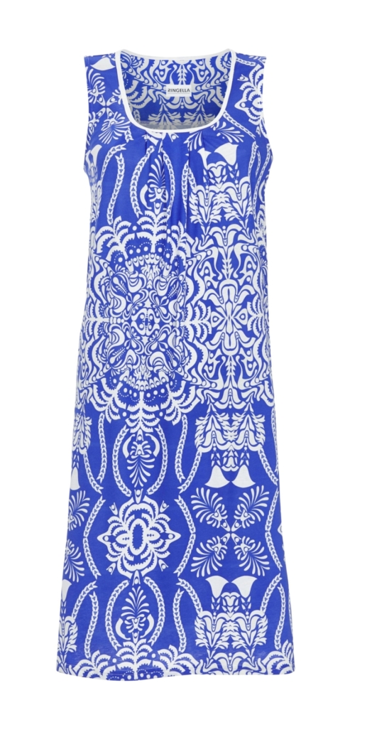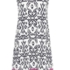Elegantes Damenkleid mit Rundhalsausschnitt und edler Biesenverarbeitung am Ausschnitt, die für eine feminine Silhouette sorgt. Das ärmellose Design macht das Kleid ideal für warme Tage. Das ornamentale Dessin verleiht dem Kleid einen stilvollen und modernen Look. Gefertigt aus hochwertiger Baumwoll-Modal-Mischung in Single Jersey-Qualität, bietet es ein angenehmes Tragegefühl und einen bequemen Sitz. Ein perfektes Kleid für schöne und entspannte Anlässe.