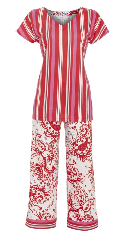 Dieser Schlafanzug ist ein stylisches Sommermodell. Das Shirt im trendigen Streifen-Dessin mit überschnittener Schulter wird mit modischer 7/8 Culotte im angesagten Paisley-Dessin kombiniert. Die Farbabstimmung ist einfach perfekt gewählt. Für Komfort sorgt der Gummizugbund der Hose mit Bindeband und die seitliche Eingrifftaschen. So können Sie sich rundum wohlfühlen. Die weiche Baumwoll-Modalware in Single Jersey-Qualität schmiegt sich an Ihren Körper an und garantiert vollsten Tragekomfort.