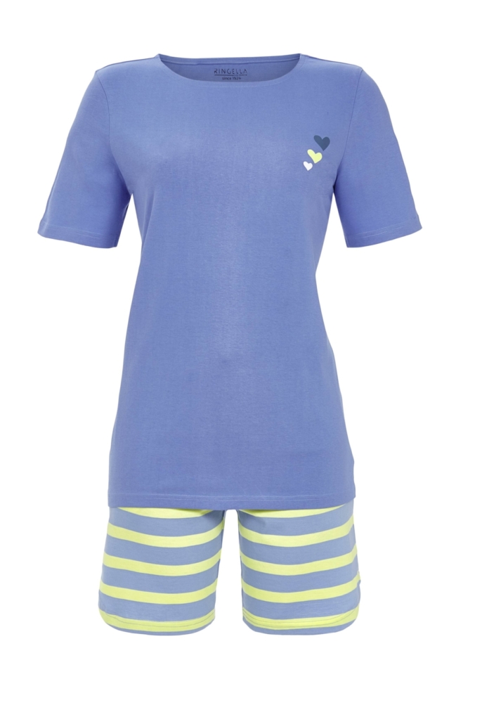 Dieser gemütliche Kurzpyjama besticht durch sein klassisches, geringeltes Design der Shorts und den angenehmen Rundhalsausschnitt des unifarbigen Shirts. Die kurzen Ärmel sorgen für ein luftiges Tragegefühl, ideal für warme Nächte. Auffällig ist der niedliche Motivdruck mit kleinen Herzchen auf der linken Brust. Der garngefärbte Ringel verleiht der Shorts einen zeitlosen und stilvollen Look. Die hochwertige Baumwolle hinterläßt ein schönes Gefühl auf der Haut und macht den Kurzpyjama zum absoluten Lieblingsteil. Perfekt für entspannte Nächte und bequeme Stunden zu Hause.