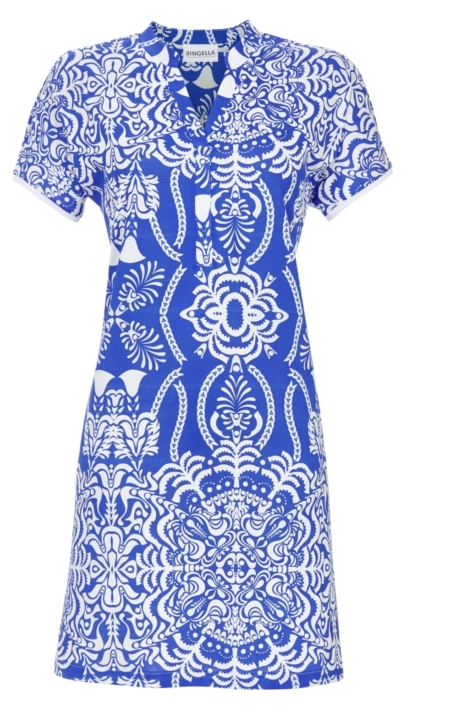 Stylisches Tunikakleid mit ornamentalem Dessin, das elegante und verspielte Akzente setzt. Die überschnittenen Schultern sorgen für einen lässigen und femininen Look. Der dekorative Splitneck ergänzt das Design perfekt. Gefertigt aus hochwertiger Baumwoll-Modal-Mischung in Single Jersey-Qualität bietet es ein angenehmes Tragegefühl und eine schöne, lockere Passform. Einfach ideal für entspannte und stilvolle Tage.