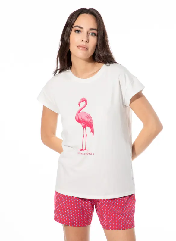 Genießen Sie bequeme Nächte mit unserem wunderschönen Schlafhirt für Damen mit kurzen Ärmeln von SHORT STORIES. Der sommerliche große Flamingo-Print in Pink auf beigem Hintergrund macht dieses kurzärmelige Damen-Schlafshirt zum Hingucker. Die überschnittenen Schultern bieten eine lässige Passform und einen coolen Look. Passende Damen-Schlafhosen in langer und kurzer Schnittform mit einen Flamingo-Allover sind in unserem Online-Shop erhältlich. Stellen Sie sich ihr passendes Nachtwäsche-Set für den Sommer zusammen!