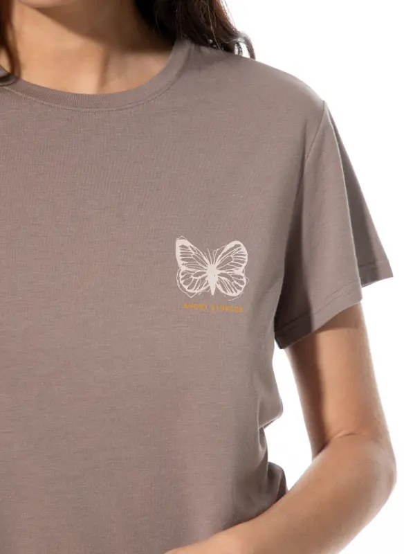 Das Damen-Schlafshirt von SHORT STORIES besteht aus weichem, elastischem Jersey (47 % Baumwolle, 47 % Modal, 6 % Elasthan) und überzeugt mit einer besonders glatten, anschmiegsamen Oberfläche. Der gerade, locker fallende Schnitt mit kurzen Ärmeln und klassischem Rundhalsausschnitt sorgt für angenehmen Tragekomfort. In warmem Braun gehalten, ziert ein dezent gezeichneter Schmetterling die Brust und verleiht dem Shirt einen femininen Akzent. Perfekt zum Schlafen oder für entspannte Stunden zu Hause als lässiges Homewear-Oberteil.